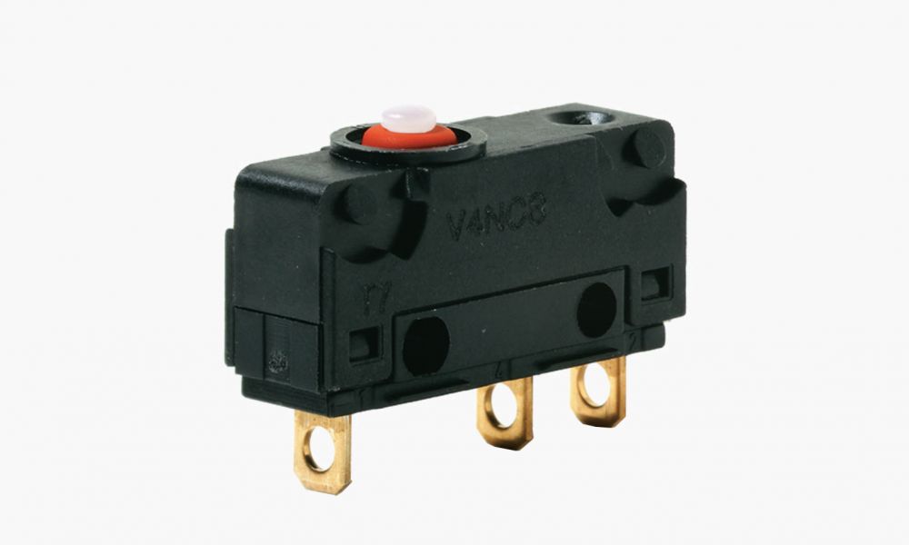 Microswitch V4NCS of Johnson Electric, brand saia-burgess. These microswitches are widely used in automated industry and automotive industry: small size, high electrical and mechanical life, sealed, customer specific connection methods.